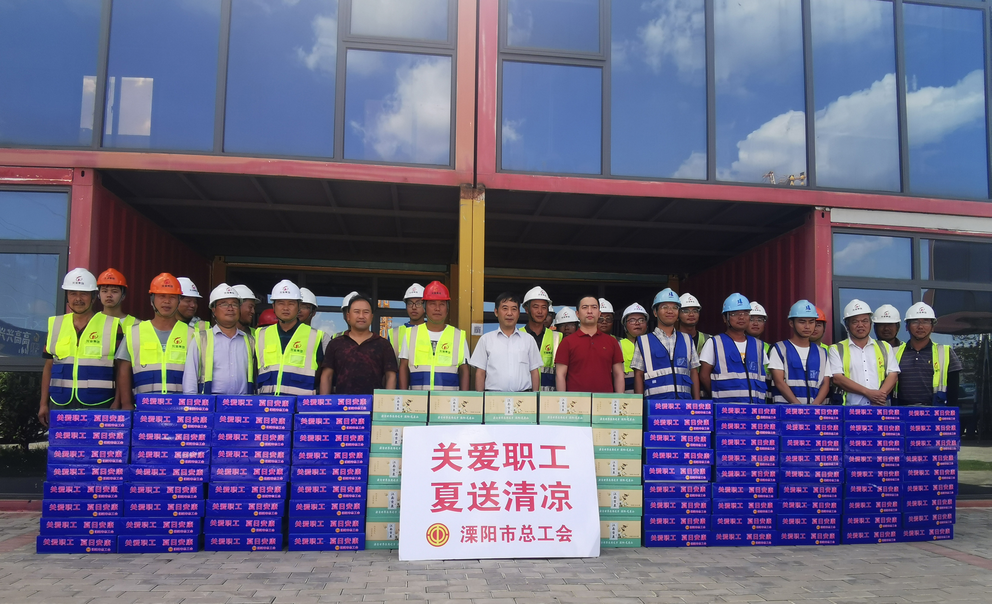 7月23日下午,正值盛夏時(shí)節(jié),酷暑當(dāng)頭,驕陽(yáng)似火,溧陽(yáng)市總工會(huì)萬(wàn)如才主任、秦益明部長(zhǎng)等一行數(shù)人,走訪慰問(wèn)了我司創(chuàng)優(yōu)立功重點(diǎn)項(xiàng)目—南航二期三標(biāo)段項(xiàng)目部,開(kāi)展“夏送清涼、關(guān)愛(ài)民工”慰問(wèn)活動(dòng),向奮斗在高溫一線的建筑工人送上總工會(huì)的關(guān)愛(ài),并送上一百多箱水果和礦泉水。集團(tuán)總裁周瑜陪同接待。